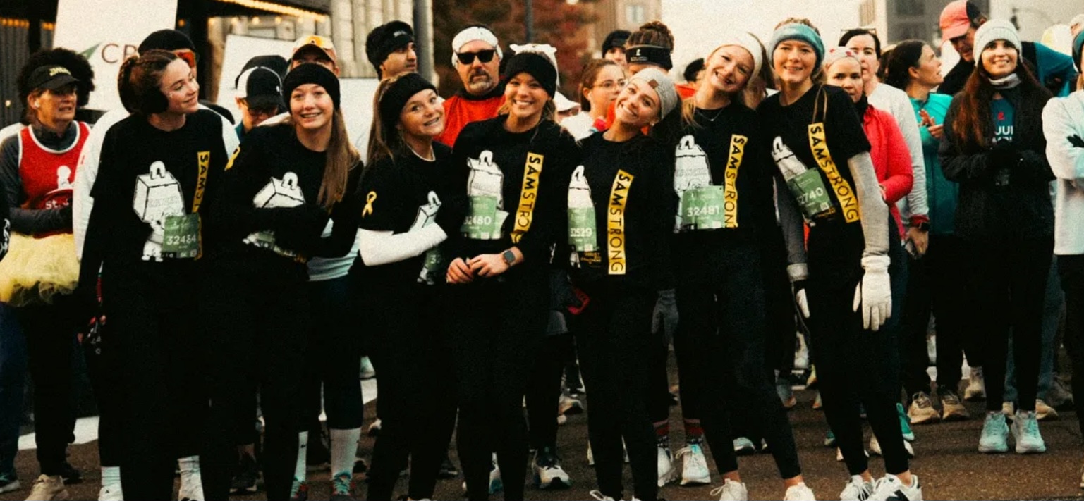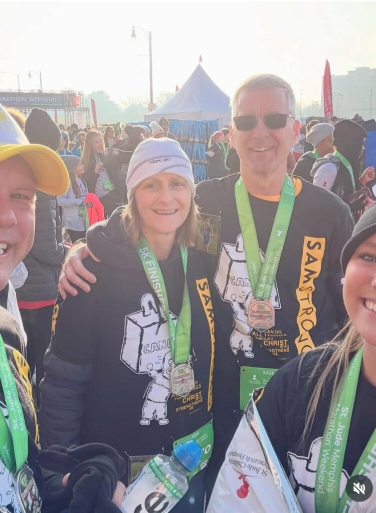 The St. Jude Memphis Marathon Weekend never fails to bring memories, inspiration, and hope, and this year was no exception. This year was made even more special by the SamStrong team welcoming our nephew Mark, his oldest daughter Emmaline, and six of Emmaline’s friends. It meant so much to us to have them join us in the 5k, honoring Sam’s legacy and supporting the kids of St. Jude. As the girls were lined up for the start, joining in the pre-race celebrations, the race announcer spotted them and gave a big shout-out to Team SamStrong. What a moment! We all had a great time, and enthusiasm was built for an even stronger return in 2026!